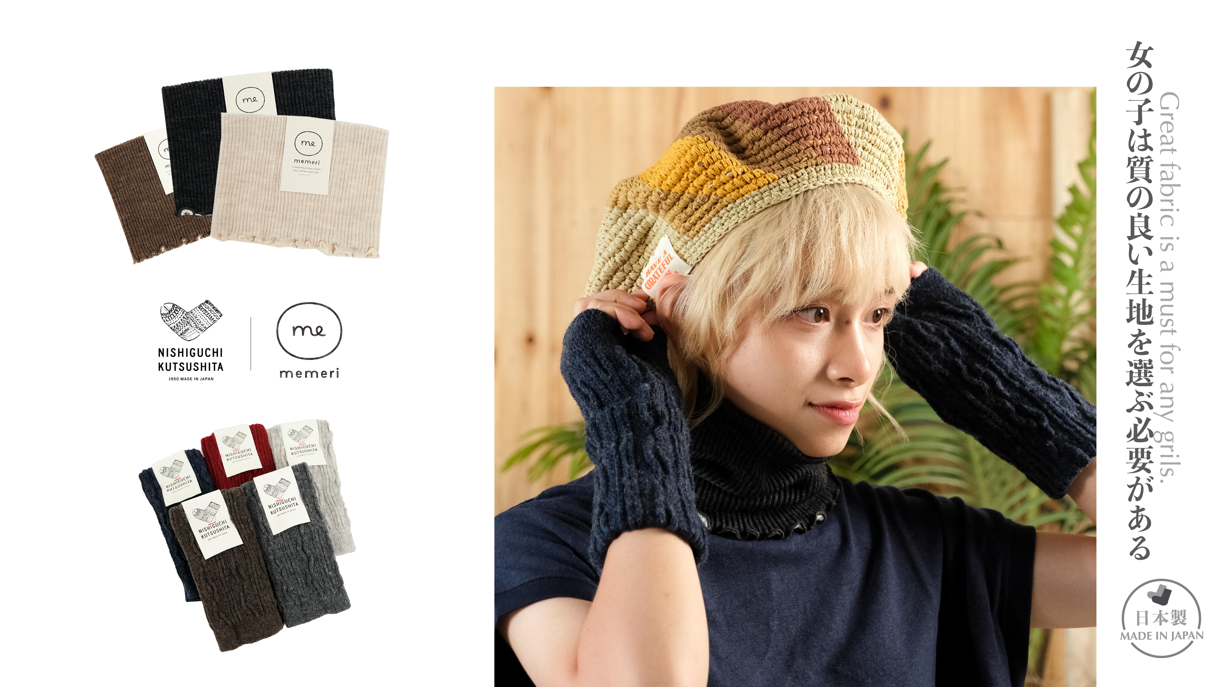 Knitwin 襪子公司旗下有三個品牌,分別是NISHIGUCHI KUTSUSHITA、memeri及hakne。